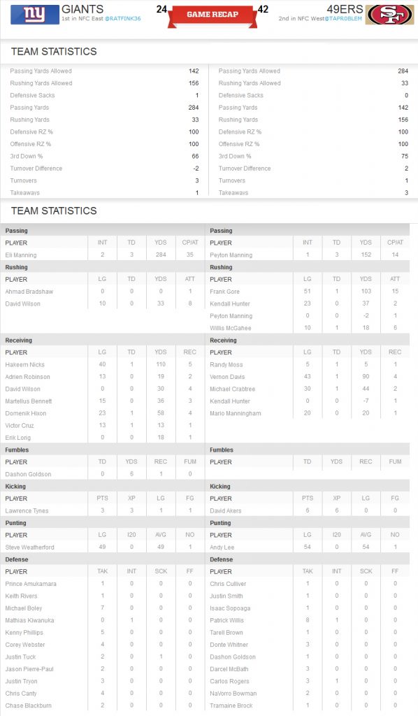 Peyton Manning made his 49er debut going 9 for 14 for 152 yards 3 td 1 int and a passer rating of 110.7 “I kinda of got away with one today, the pass rush was coming hard all day. I threw a dart backfooted and Michael Crabtree made a spectacular catch.” Crabtree went for 2 rec 44 yards and a td. Randy Moss only had 1 rec but for a td for 5 yards. Vernon Davis seemed to be Manning’s top target for the day with 4 rec for 90 yards and a td.
