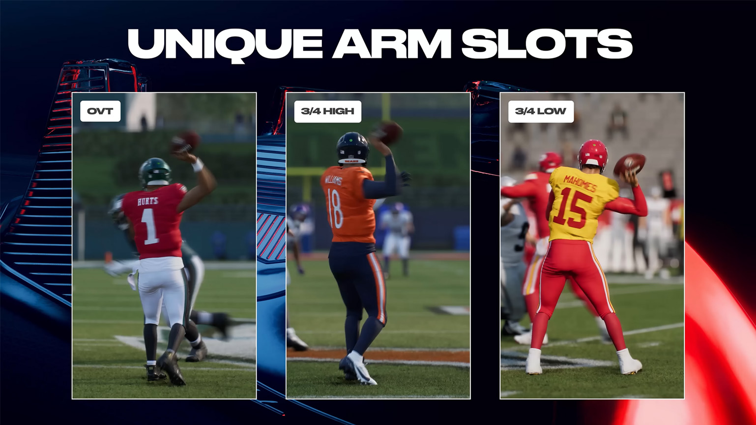 Three new base arm slots - Over-the-top, 3/4 High, and 3/4 Low - are assigned to QBs based on their real-life tendencies. Some players (like Stafford) dynamically shift between them based on the throwing lane.